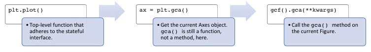 Calling plt.plot() is just a convenient way to get the current Axes of the current Figure and then call its plot() method. This is what is meant by the assertion that the stateful interface always “implicitly tracks” the plot that it wants to reference.