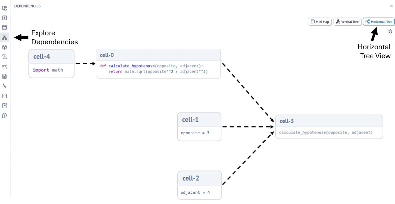 - Finally, notice that the numbers to the left of each cell indicate the line numbers of the code within the cell. Unlike most other notebooks, there are no numbers to indicate the running order of the cells. This is because marimo allows you to add code cells in any order. marimo can work out the correct cell running order for itself. Even so, placing cells in an illogical order should be avoided.