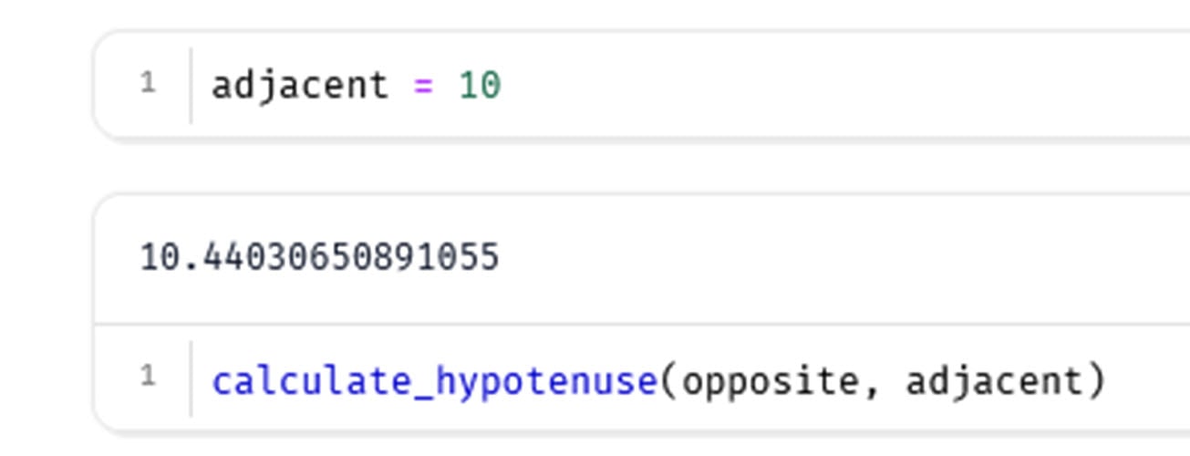 You then run another version of the calculation by updating adjacent to 12 in cell eight, and calling calculate_hypotenuse() again. This time, your function uses the latest adjacent value of 12 plus the most recent opposite=5 value defined in cell six. The hypotenuse now has a length of 13.
