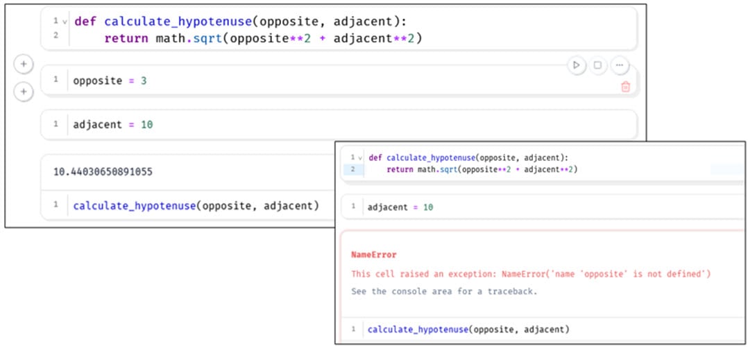 This can also confuse anyone reading the notebook because it wouldn’t be immediately clear what’s happening based on what’s available. Furthermore, the next time the kernel is restarted or the notebook is passed to another person, it would fail to run because neither the import nor calculate_hypotenuse() code would be present.