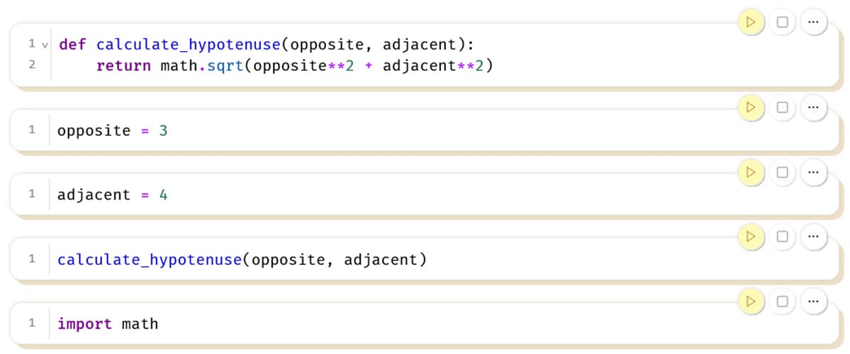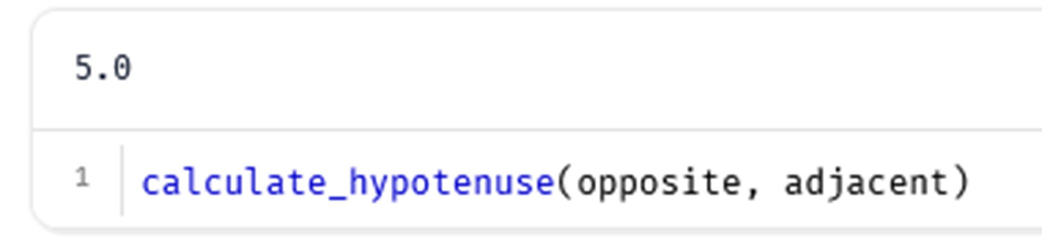 opposite = 3into the first of these cells,adjacent = 4into the second, then the function callcalculate_hypotenuse(opposite, adjacent)into the third blank cell. Again, don’t run any of these cells just yet. -