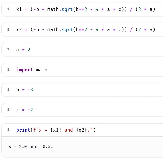 The main point of this section is to see how a notebook containing poorly ordered cells will cope when it’s run as a script. Now that your reader knows what they’ll be doing, you can add the Python code to solve your quadratic equation.